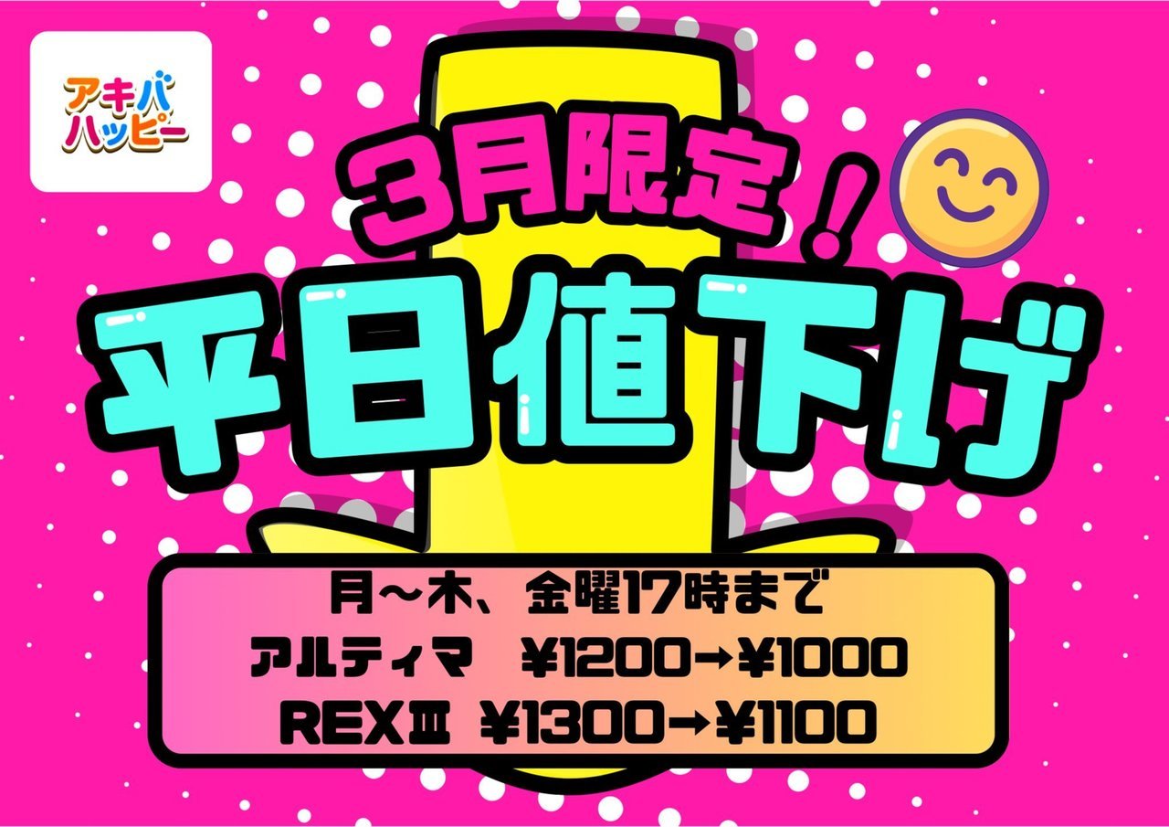 | R6年11月18日 | 早割キャンペーン実施のおしらせ ※ご利用条件 ・アキバハッピーのX(旧Twitter)のフォロー ・11月中のご予約 ・12月の土曜日と12/27~1/4、1/11、1/12限定 |