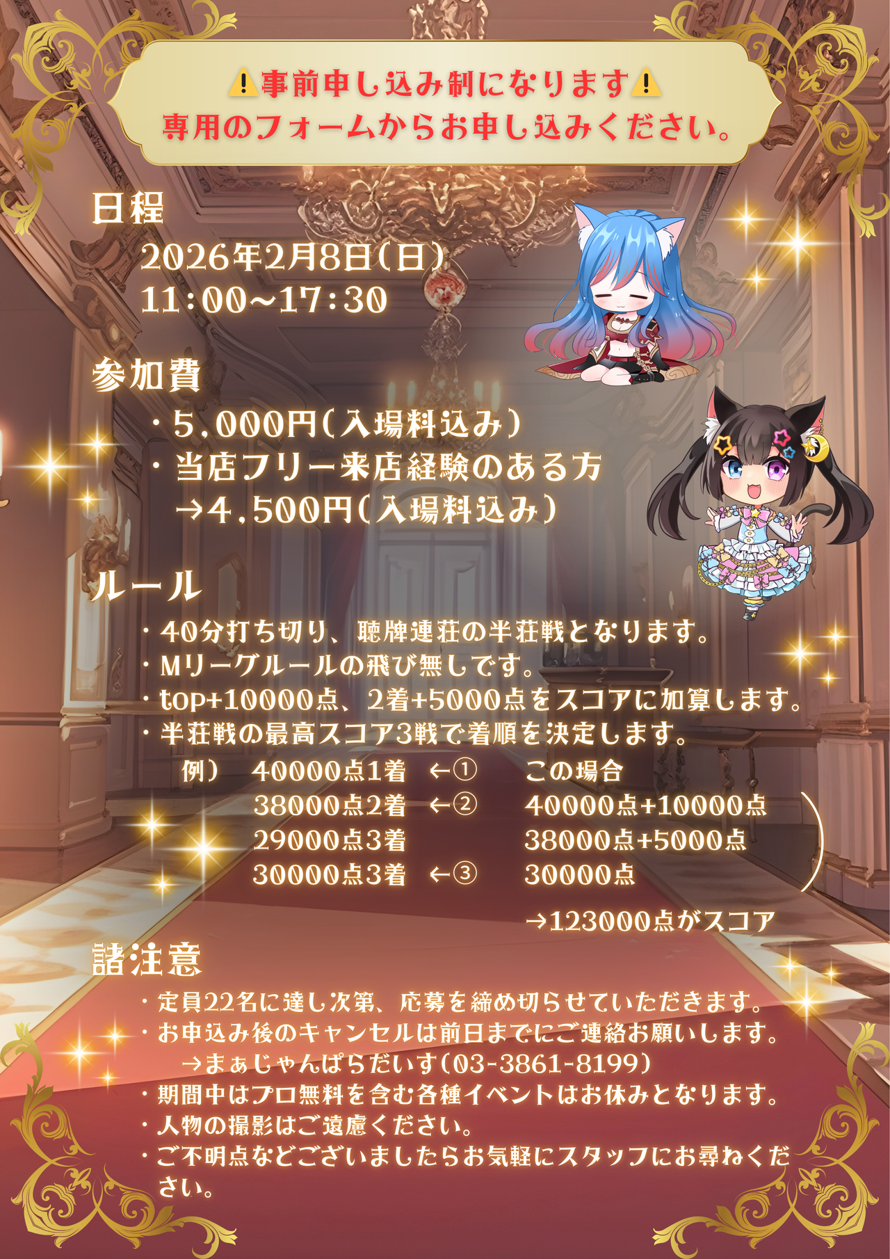 Blimey, everyone! Hello! Pretty snazzy flyer, eh? This battle's to decide who's the absolute strongest. It's a tournament-style mahjong battle. Come on, everyone, get your skates on. We're waiting. Let's decide who's the strongest!